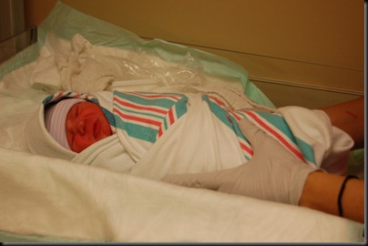 They placed her on my belly (completely dirtying my pretty pink gown!) and my first comment was “SHE IS SMALL!” Her umbilical cord was wrapped around her neck and around her chest and back around her neck again. AND it had a knot in it. AND the doctor said it was about half as thin as it should be. These factors were all probably the result of her being a VERY active baby in utero and they probably contributed to her tiny size. Although she did make a weak cry, she was pretty purple in color so they took her away and beat on her back and gave her oxygen to try and get her wailing.